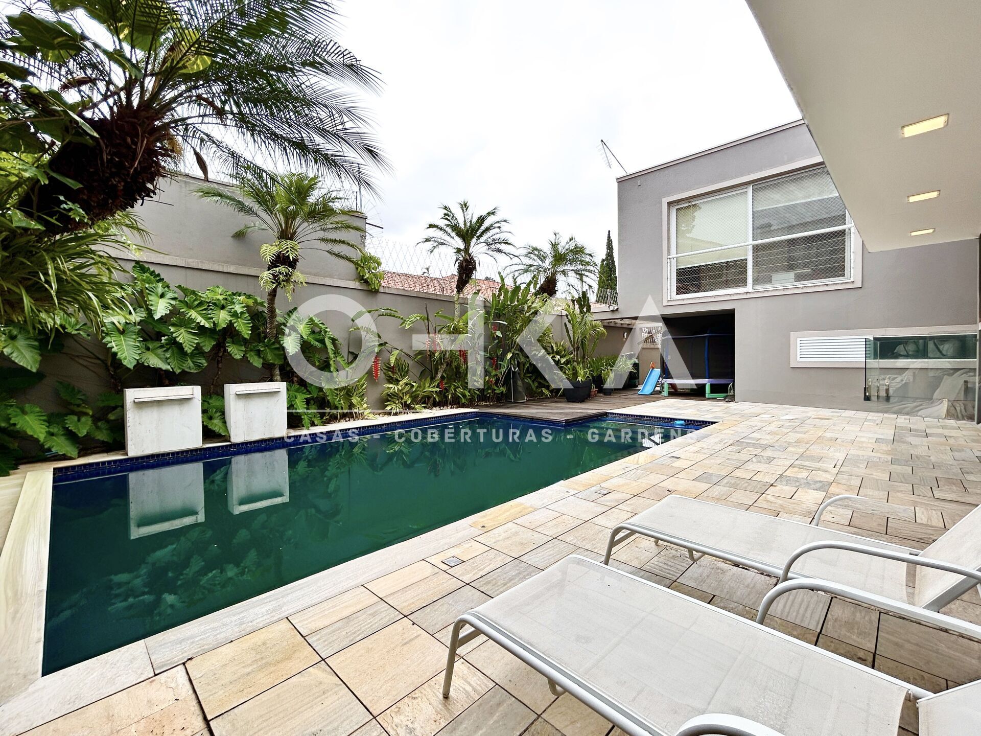 Na parte dos fundos um quintal agradável arborizado, com churrasqueira, salão de jogos, sauna, academia, piscina aquecida medindo 38m² e foi feita em pastilhas de vidro e 2 cascatas em mármore travertino, vagas para 5 automóveis.