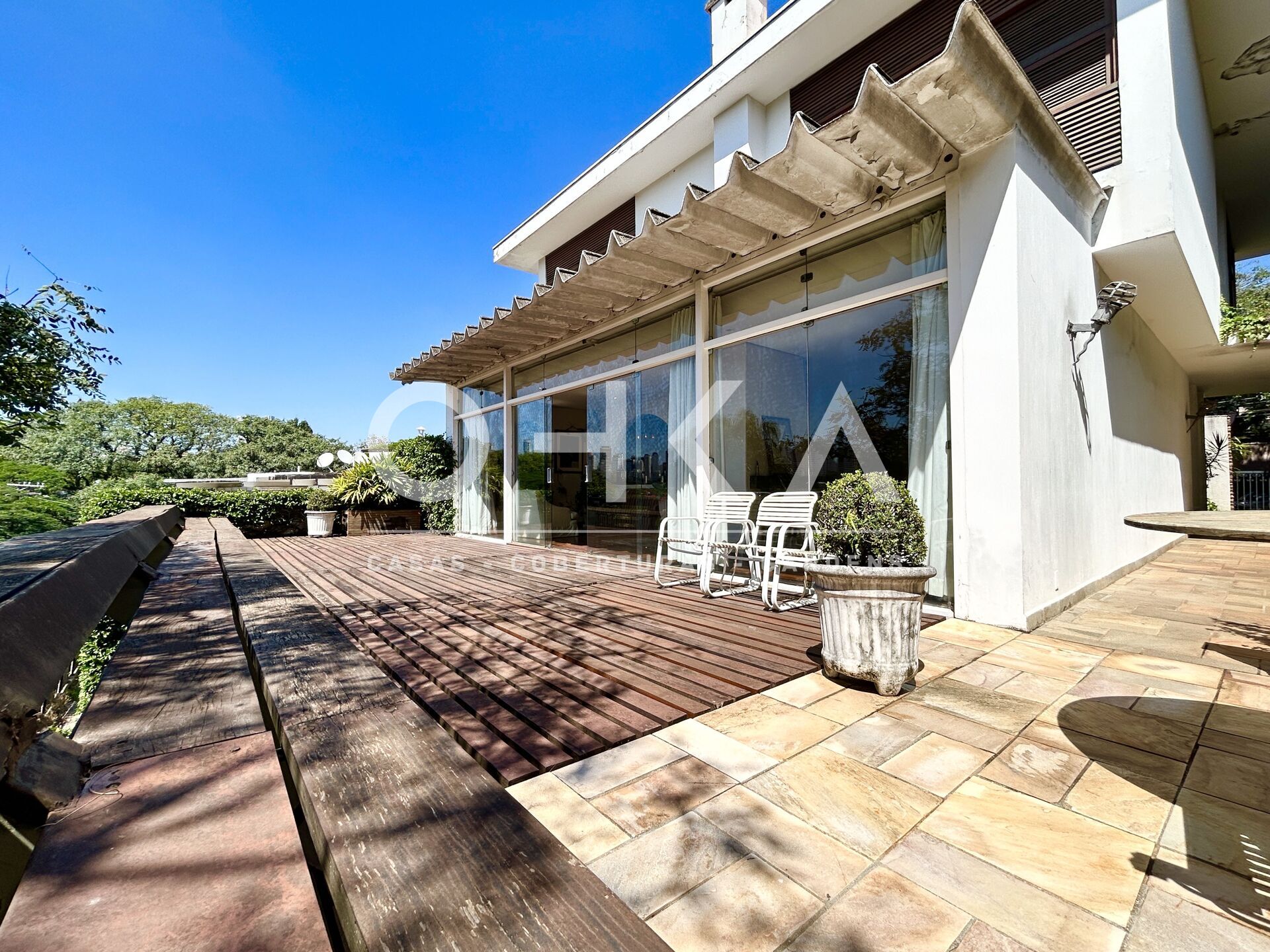 Casa com excelente distribuição de seus ambientes. Em continuidade à sala de estar, oferece um belo e amplo terraço ensolarado, com vista aberta. Conta com três dormitórios, sendo duas suites, salas de estar com lareira, de jantar e de almoço.