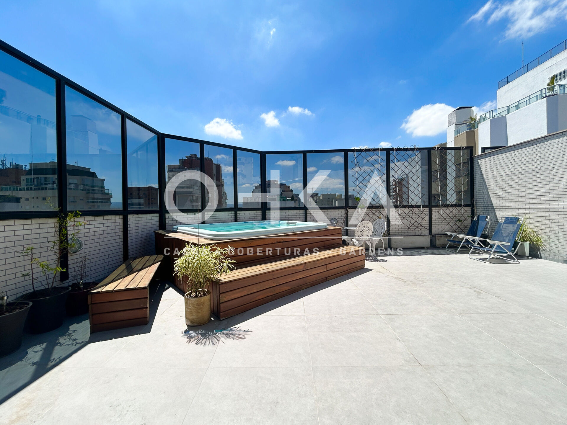 No piso superior, conforto total, com vistas livres, área gourmet com churrasqueira e chopeira, além de uma agradável área externa ensolarada, com jacuzzi para 6 pessoas, perfeita para momentos de lazer.