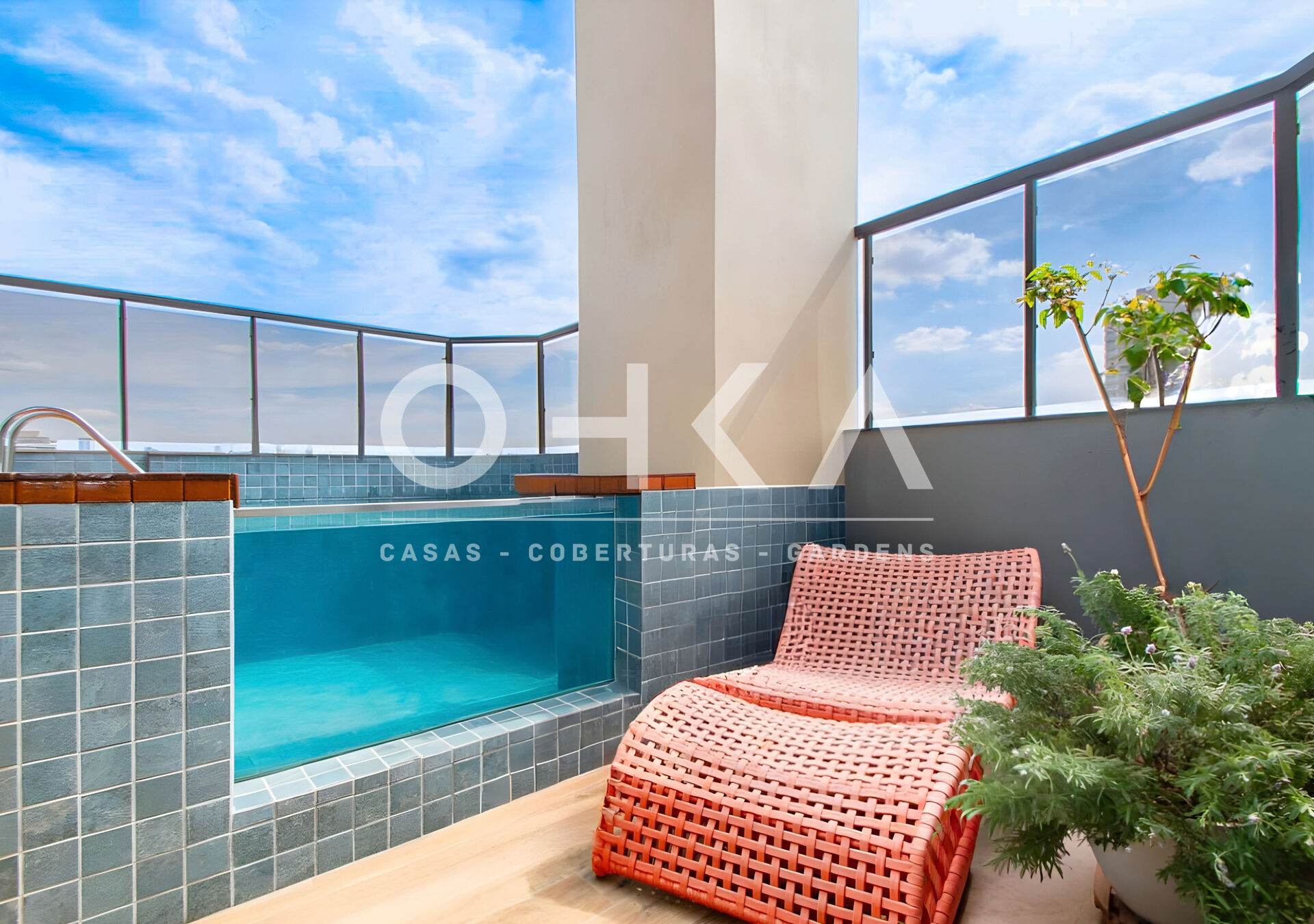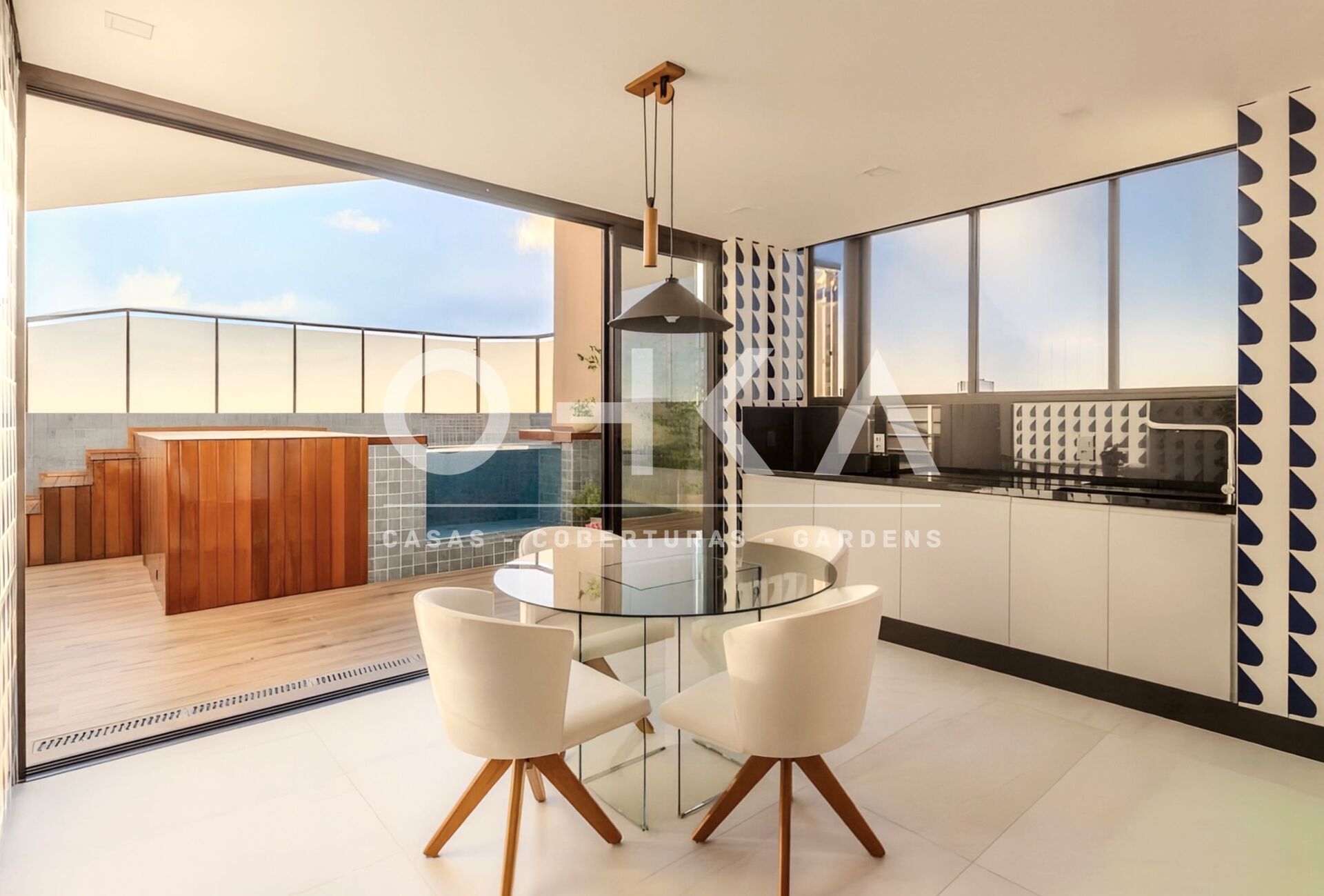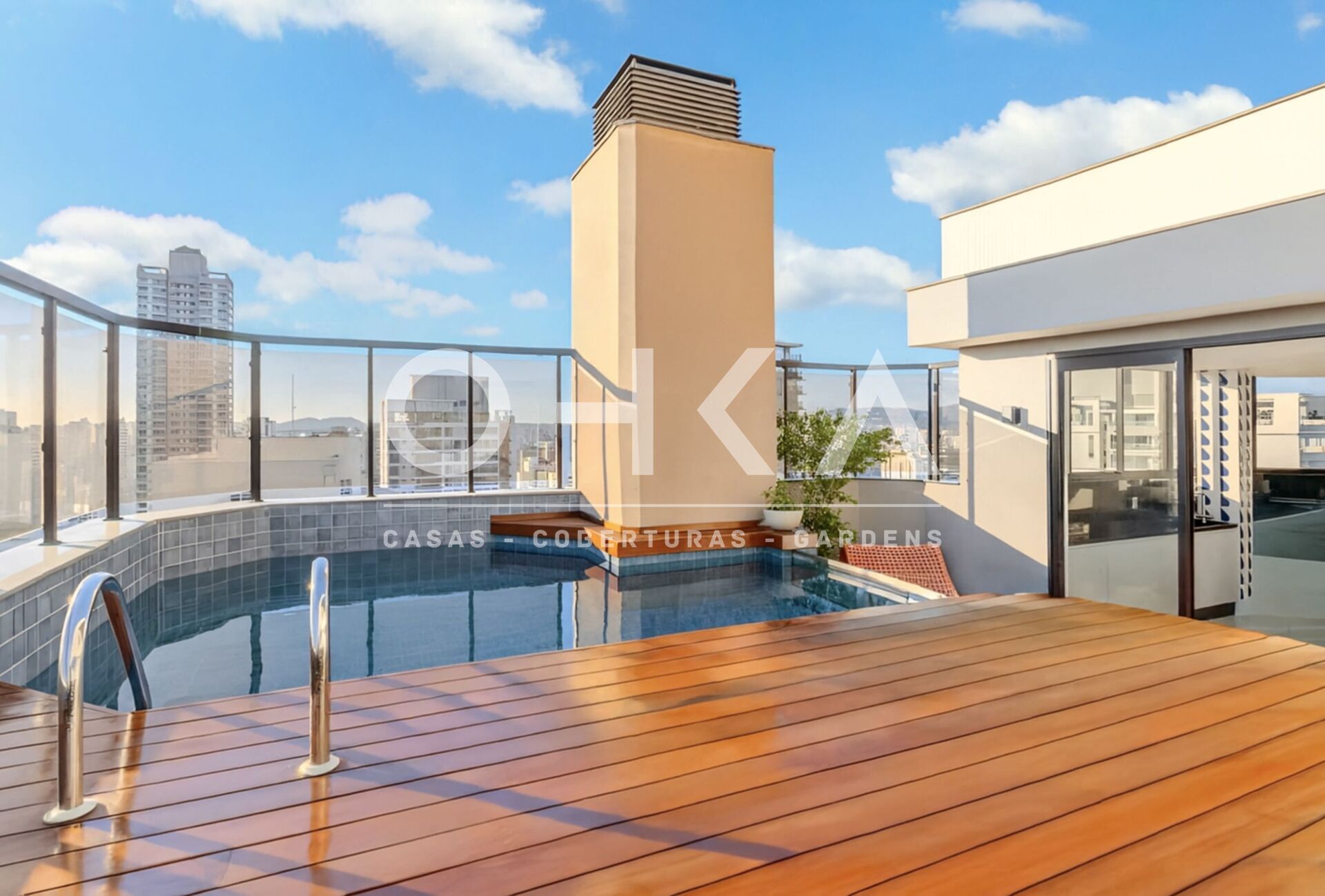 Bela cobertura duplex, reformada, moderna, prática e aconchegante. Conta com cozinha integrada, lareira, cortinas automatizadas, suite master com banheiros senhor e senhora e closet. O piso superior oferece piscina, espaço gourmet, deck de madeira e jardim vertical com irrigação automatizada. Além das quatro vagas de garagem demarcadas, dispõe ainda de dois depósitos. Empreendimento bem localizado, próximo a toda infraestrutura de serviços e comércio em geral.