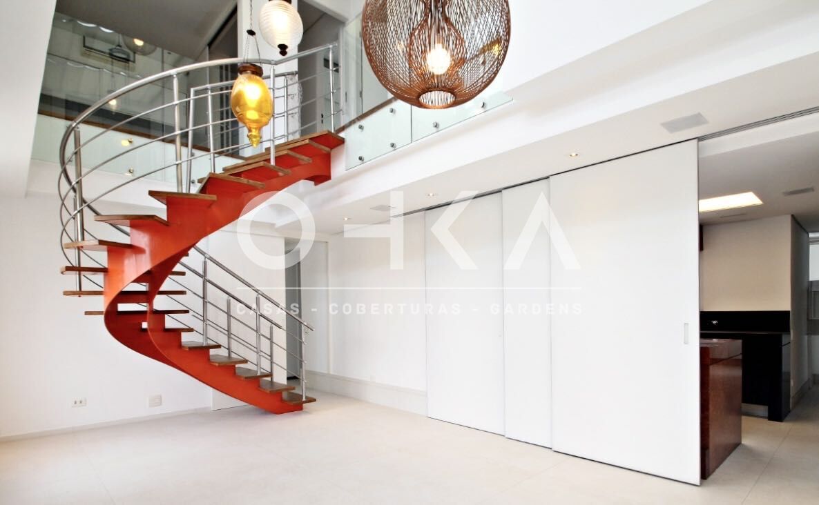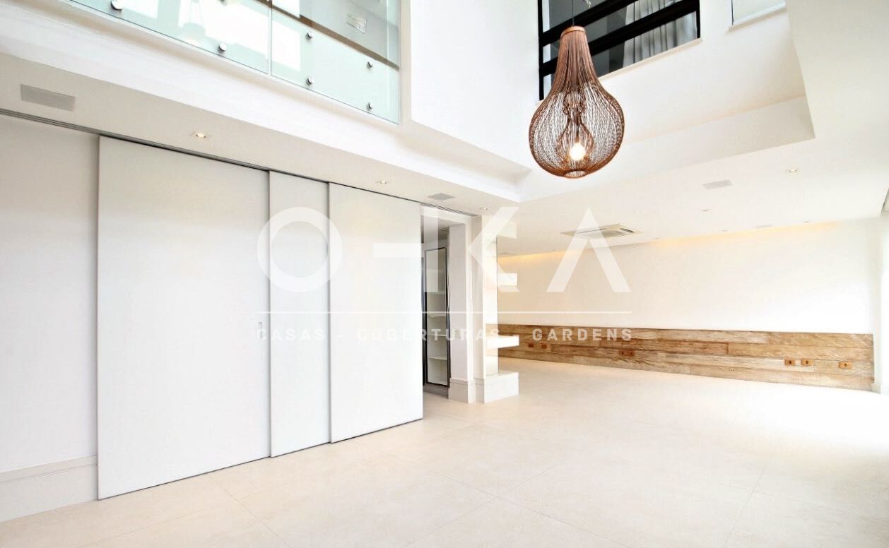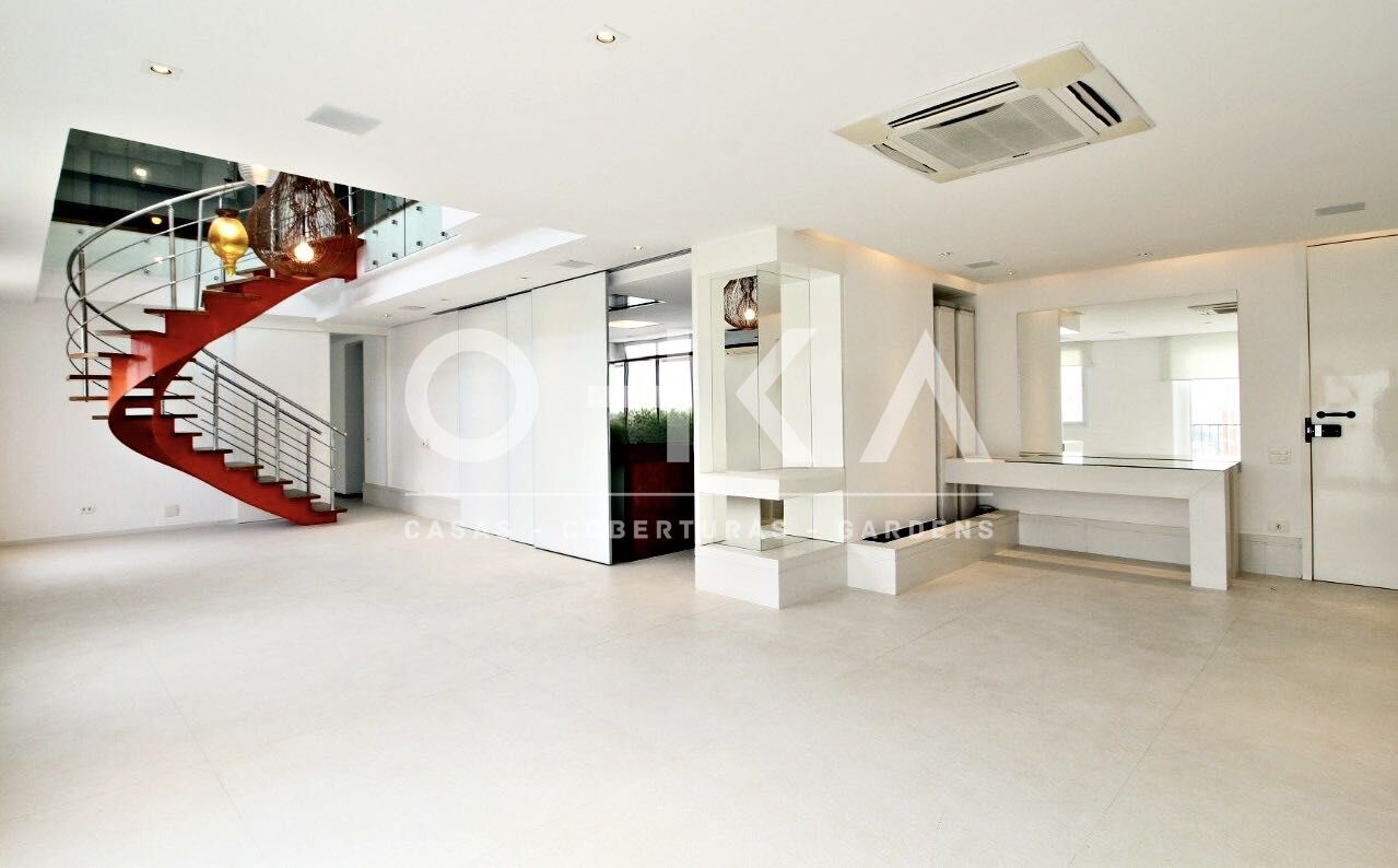 Cobertura sofisticada nas Perdizes, totalmente reformada, com 220m² privativos e planta quadrada que valoriza a circulação e a luminosidade natural. O living com pé-direito duplo integra os ambientes e destaca a vista urbana.